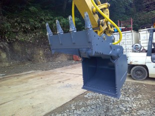 バケット容量を最大限確保し、強度、グリップ力、メンテナンス性を考慮した構造としています。敷均しなど平爪を必要とする作業に於いては、フォーク部を開いて行うことにより、交換式のブレードがこの役割を果たします。
