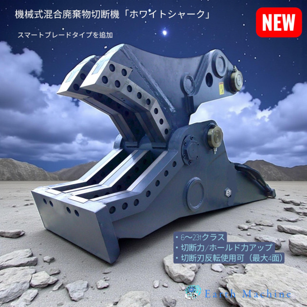 機械式混合廃棄物切断機「ホワイトシャーク」にスマートブレードタイプを追加 切断力・ホールド力をアップし、切断の際の負荷抵抗を抑えたタイプです。 切断刃をパーツ分けし、切れ味に優れ、欠けに強く耐摩耗性が