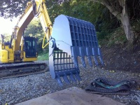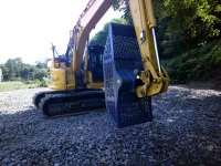 油圧ショベル用大型土嚢(1トンパック)専用グラップル 製品概要 本商品は、製作後の大型土嚢を傷を付けずに、安全に正確に早く、設置作業や回収作業を行うために開発された商品です。 機械の特長 標準のフォー