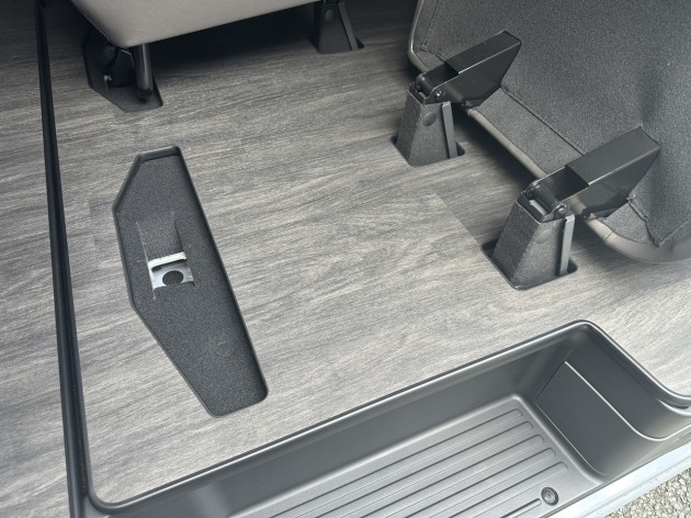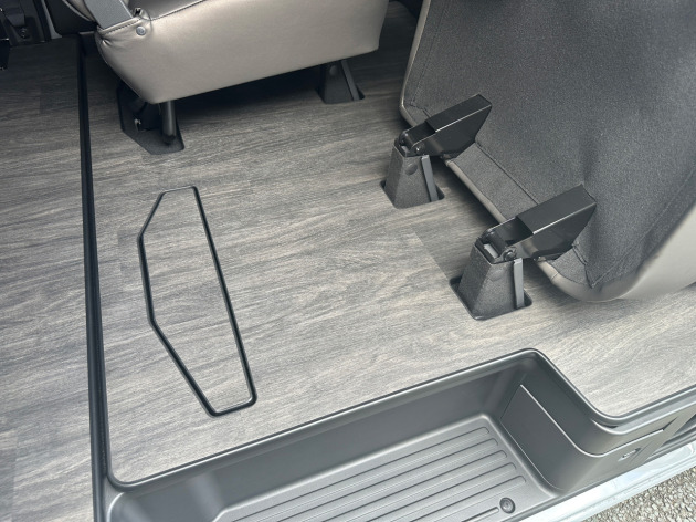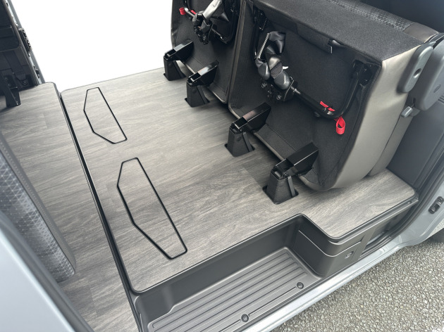 そんなマルチベッドに装備されているフロアパネルはセカンドシートから後の荷室サイズで設計されていて、シート下部分は純正カーペットのままとなっています。