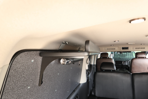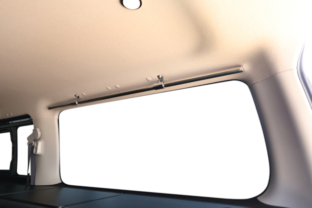 運転席側リアウィンドウ上部分にはESサイドマルチパイプラックを取付けました。パイプラックがあることで、キャンプやランニングで使ったタオルを干したり、シェラカップやS字フックなどを吊るすなど、デッドスペースになってしまう窓部分を有効活用していただけます。