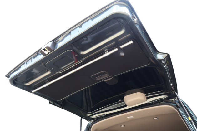 バックドアにはESリアパイプラックを設置。ドアを開けた時に頭上にパイプラックがあることで、ランタンを吊るしたりタオルや着替えなどを干しておくことができます。