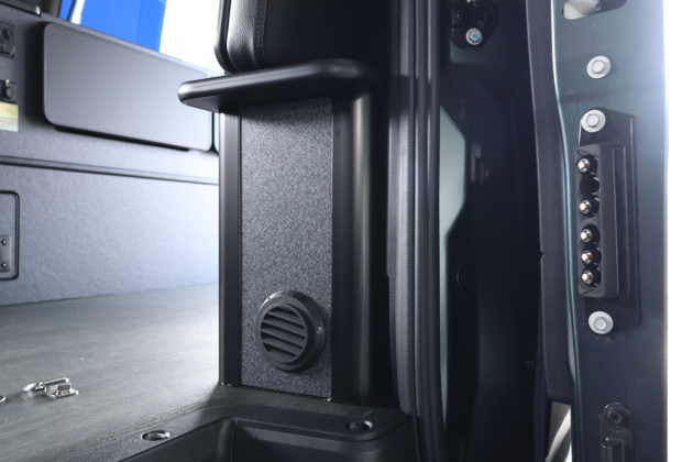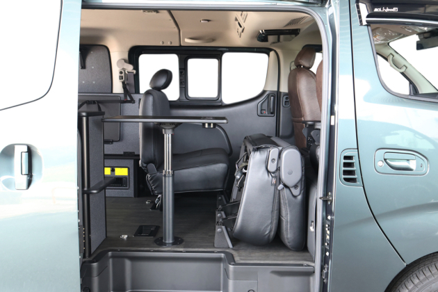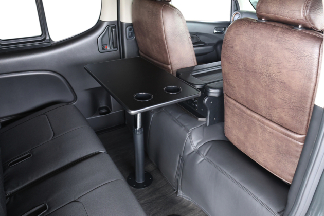 セカンドシート前2箇所と、運転席側セカンドシートの下部分にテーブルが展開できるようポールテーブル土台を設置しました。キャラバン上位グレードに設定されている分割シートに合わせて展開できるように土台の位置を設定し、どちらのシートを跳ね上げてもシート前でテーブルを使用することができます!