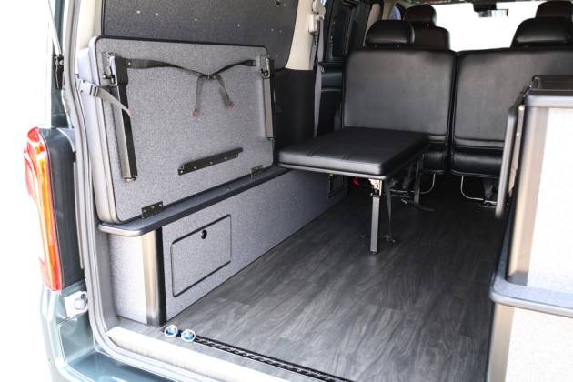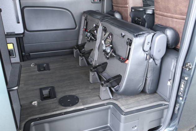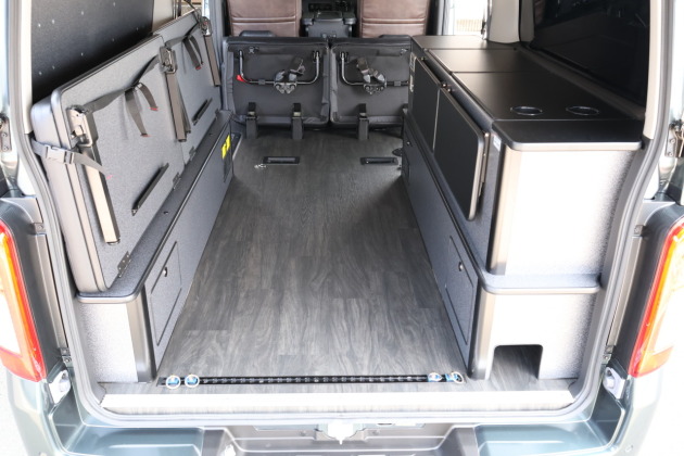 キャラバンのフロア全面にはSH床貼り施工を行いました。汚れや傷などを気にせず荷物が積載できるのはもちろん、セカンドシート下部分も床が貼られているためシートを跳ね上げてテントや椅子など長物の荷物が積載可能に。荷物固定用のフックなども一緒にフロアへ埋め込んでいます!