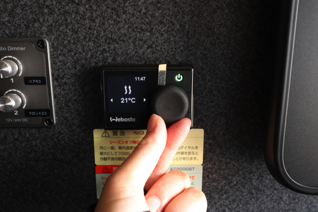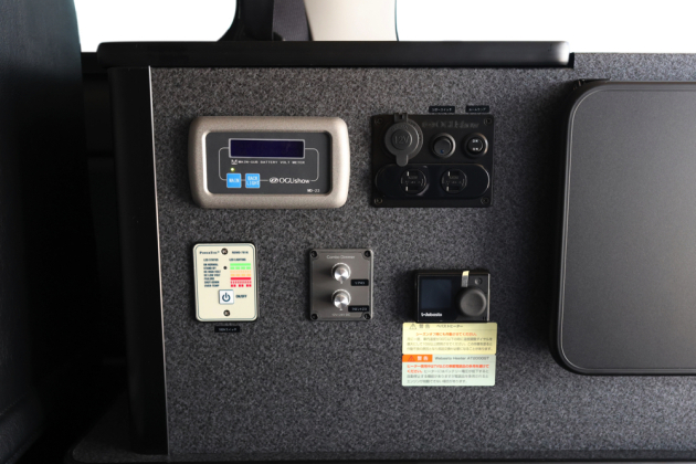 寒い時期の車中泊に欠かせないのがFFヒーターです。1台あるだけで車内を十分に暖めてくれるため冬の車中泊も安心・快適!コントローラーから温度・風量も調節できるので気温や季節に合わせて最適な温度で過ごしていただけます。ヒーター本体は助手席側ベッドBOXに収納しています。