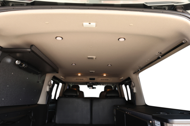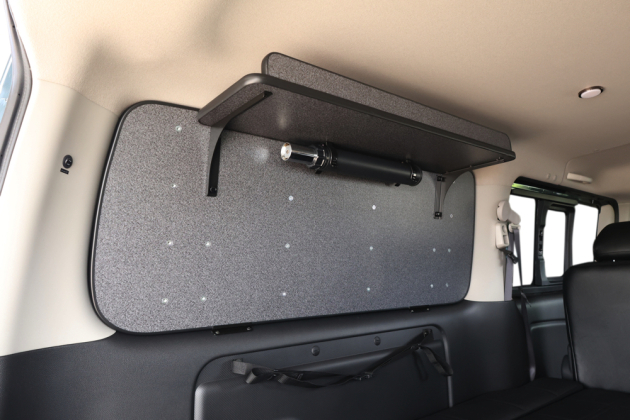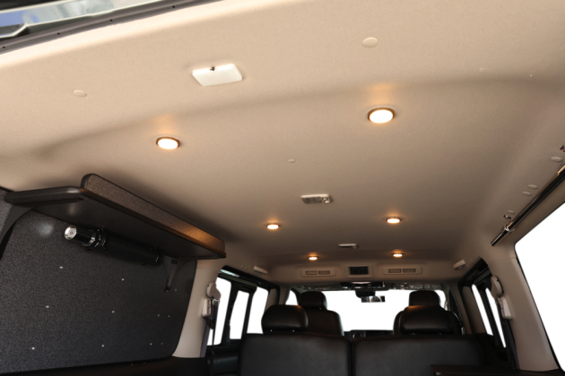 車内の天井部分には暖色カラーのLEDライトを合計6個増設しました。前2個・後4個で調光機能も搭載しているので、車内の過ごし方に合わせてお好みの明るさに調節していただけます。ライトのコントローラーはオーダー棚に搭載しています。