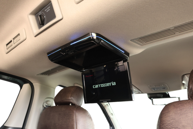 車中泊キャンプ中や室内で休憩中にベッドでくつろぎながらテレビが見れるよう、カロッツリアのフリップダウンモニターをリアクーラー下部分に搭載。画面はコンパクトに収納できるので、使用しない時は邪魔になりません。