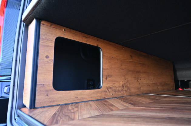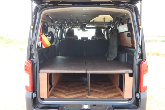 温かみのあるウッド素材、レザー&キルトといった厳選された素材がふんだんに盛り込まれた"ES TXベッド"ESTXベッドは5:5の分割跳ね上げ式、助手席側ベッドマットが3分割で設計されています。
