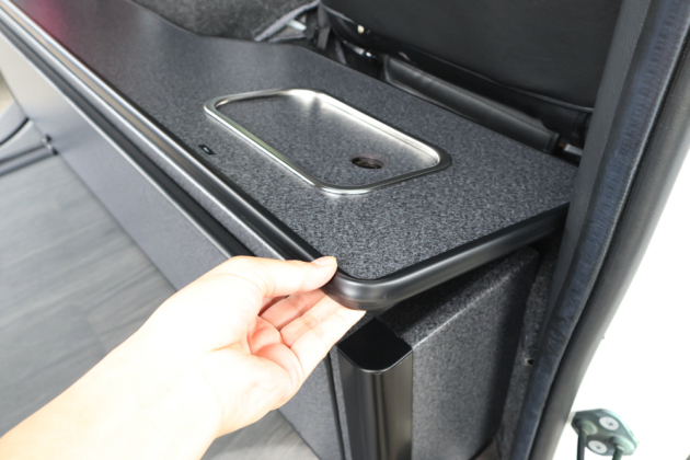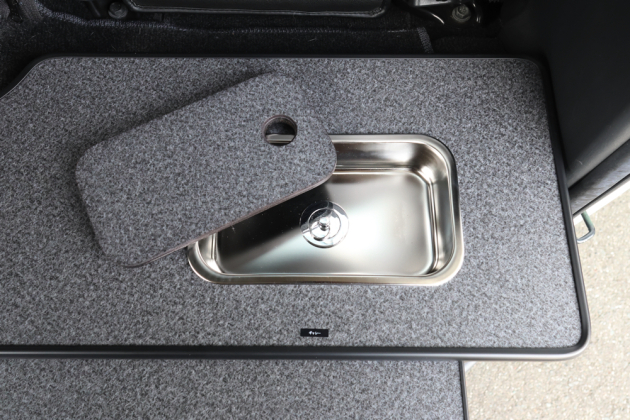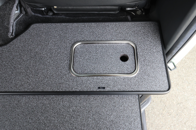 今回ベッド展開できるセカンドシート・サードシートを取付けているため、ギャレー設備はシート展開の邪魔にならないフロント側へと設置しています。