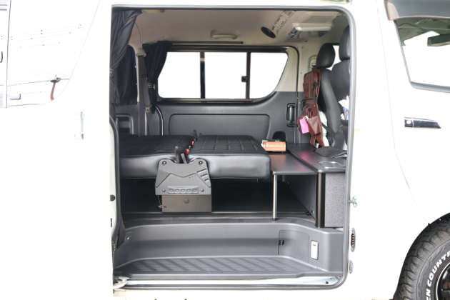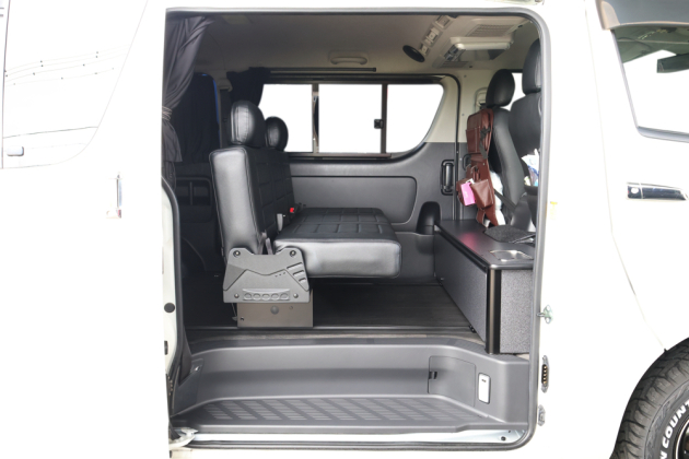 シートを2脚設置し8ナンバーで登録したこちらの200系ハイエース。8ナンバーキャンピング登録に必須なギャレー設備を搭載するため専用の特注BOXを荷室フロント側にカスタムしました!