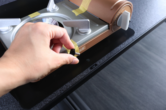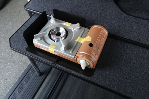 ギャレー設備を使用する際は、ボックス側面の天板を展開しポール脚を取付けてテーブルスペースを確保し、カセットコンロとポリタンクを装備します。