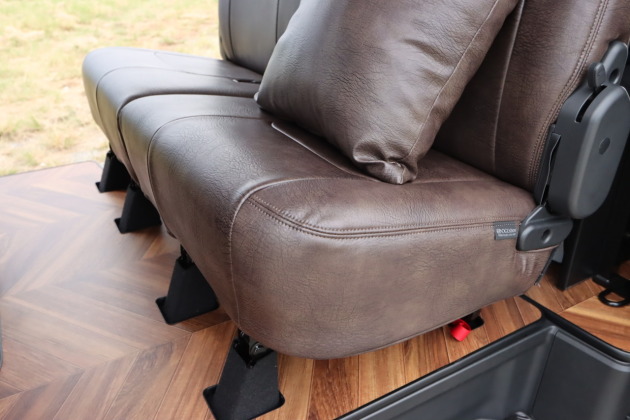 シート生地に採用しているビンテージブラウンレザーは耐久性・耐水性に優れたPVCレザータイプとなっています。シートを被せるだけで商用感のあるキャラバン純正シートが、傷や汚れに強いビンテージ感のあるシートへとグレードアップ!