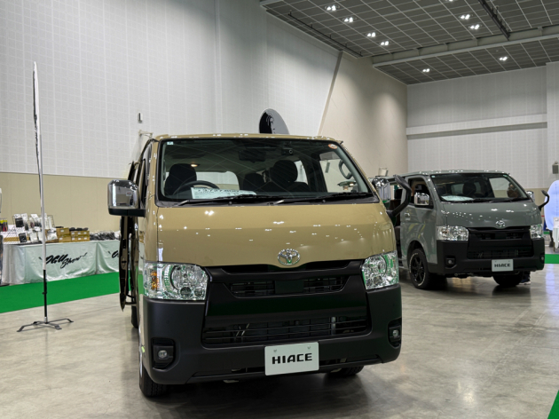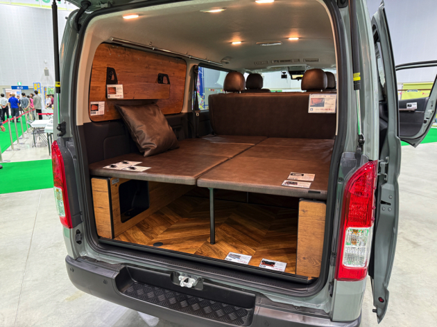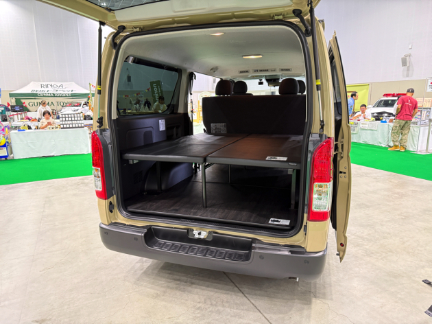 ハイエースデモカーは、ES TX CONCEPT仕様にカスタムした車両と、ESフロアパネル・ESフリップベッドを装着した車両の2台を展示。どちらもアウトドアにぴったりな車中泊仕様となっており、展開方法や生地感を実際に見て・触れてご体感いただけます。