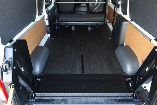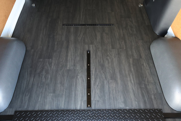 荷室全面にはトランポに欠かせないSH床貼り施工を行いました。積載するバイクが安定するのはもちろん、耐久性もアップするので、傷や汚れを気にせずバイクや工具類を積載していただけます。また今回はオーナー様の希望で、ステップ部分まで床面積を広げ、バイク固定フックを取付けるワンタッチレールを埋め込んでいます!