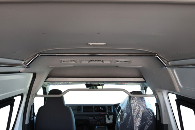 ハイルーフ車の天井空間を活用するためサイドマルチパイプラックとセンターパイプラックを天井鉄板部分にカスタム!パイプラックがあることでサーキット用のツナギをかけたり、バイク固定時に使用するタイダウンベルトをかけておいたりと小物収納として使うことができます。