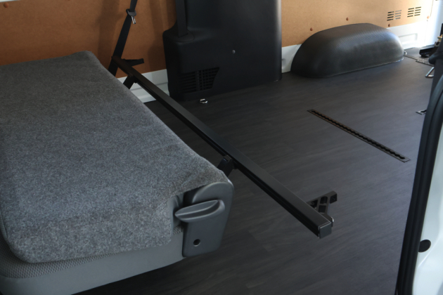 バイクの前輪を固定するために活用されるタイヤストッパーを純正セカンドシートの機構を活かして取付けました。このタイヤストッパーにタイヤをあてて固定することで、バイクが左右に動いてしまうことを防いでくれるため揺れがある走行中も安心です。