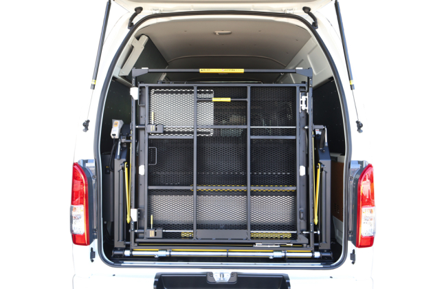 大切なバイクをもしもの事故から守るため、和光工業製バイクリフトを取付けました!バイクリフトであれば対荷重が350kgあり、ボタンで昇降の操作できるので、重たいバイクも1人で安全に積載することができます。こちらのリフトはロックを解除することで横開きが可能、バイク工具の出し入れや乗り降り時は横開きに展開することでスムーズに荷室へアクセスできます。