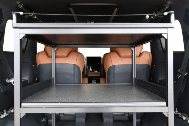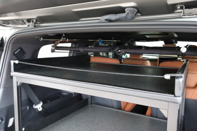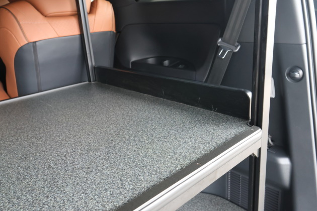 そんな荷室スペースに、オーナー様のご要望でより荷物を積載したり、雪山で電子レンジが使えるようにレンジを置くことができる特注の棚を製作させていただきました!