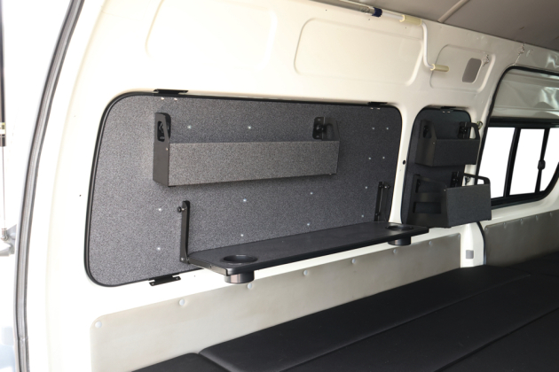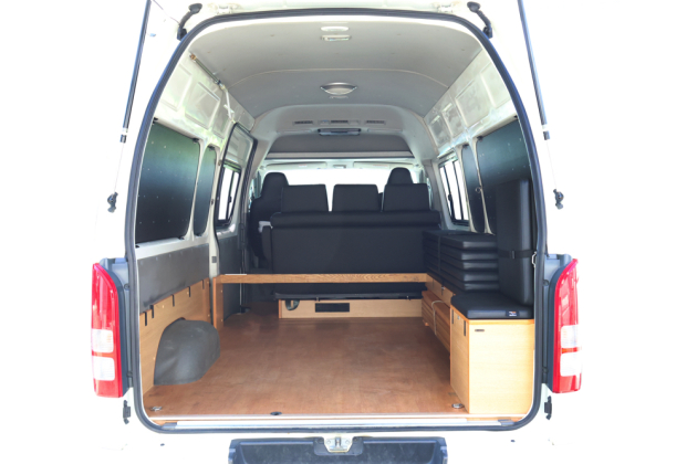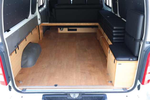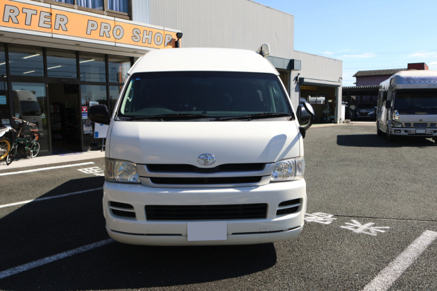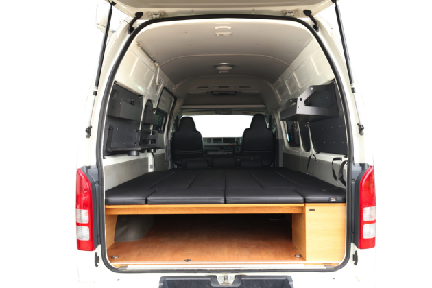 室内にはベッドやギャレー設備が搭載された車中泊可能な8ナンバー仕様の200系ハイエースになります。床貼り加工やフック類も取付けられているためバイクトランポとしても使用できます。