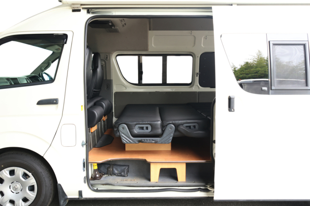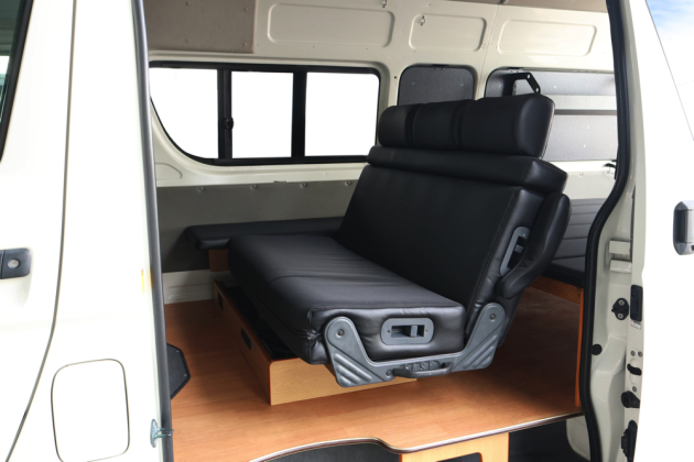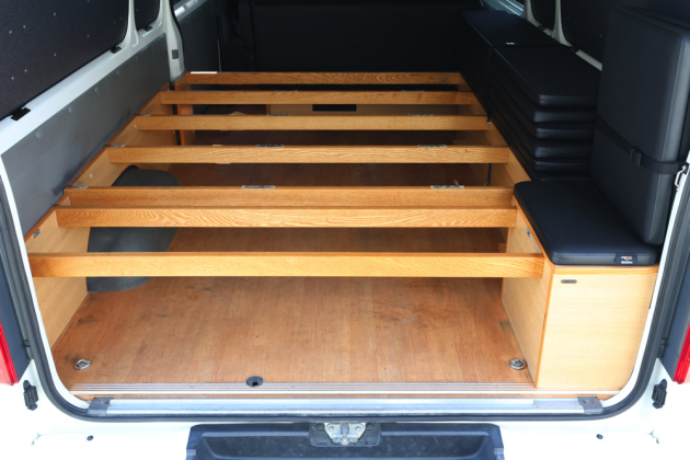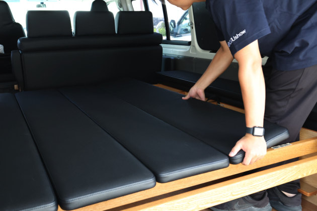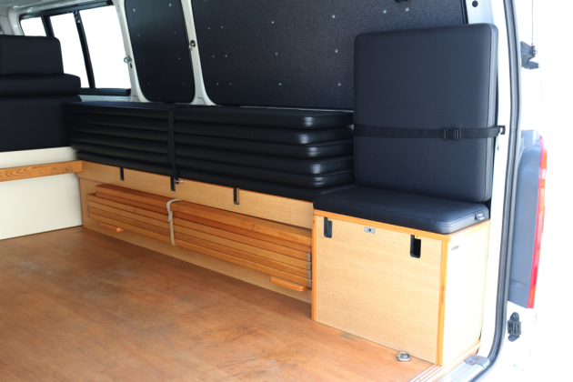 フロントシートやベッド展開できるシート、ベッドマットは耐久性に優れているオグショーオリジナルコーデュラ生地へ張り替えているため、アウトドアを楽しむ方にぴったりな1台となっています!