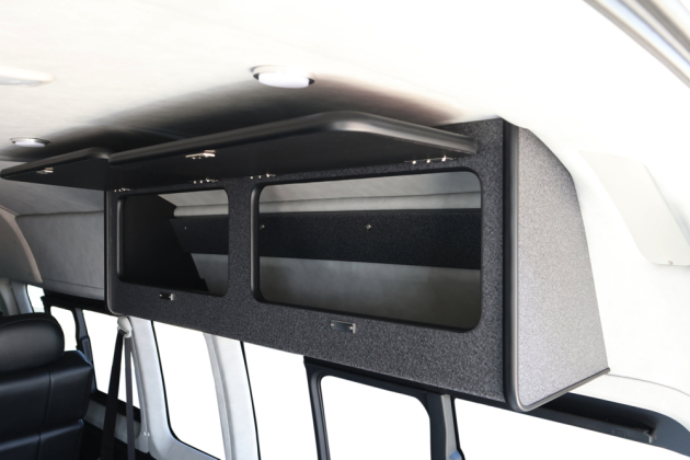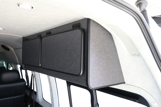 車椅子で荷室スペースが限られる中、天井にはSHトレーをカスタム。デッドスペースになりがちな天井部分を活用し、着替えやタオル、小物類などを収納できるようにしています。SHトレーには磁石でくっつく蓋が付いているため、走行中に荷物が落ちてしまう心配もありません!