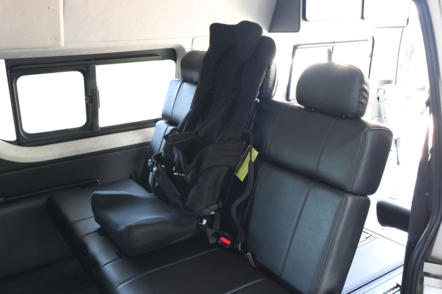 今回オーダーで、車載用の座位保持装置をしっかり固定できるよう、シートにマジックテープ加工も施しているので、より安心して乗車いただけます。