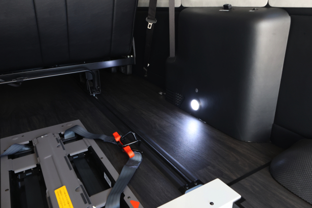 特に運転席側ボディに取付けたライトは車椅子の足元を照らしてくれるため、固定作業もスムーズに行えます。