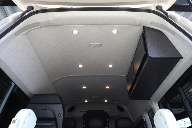 暗い時間帯でも快適に室内で過ごせるように、天井と運転席側のボディ(リアヒーター下部分)に合計9個のLEDライトを増設。