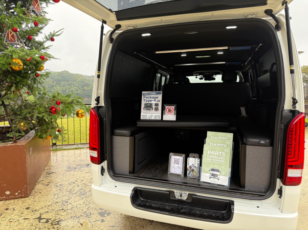 今回オグショーは会場TOYOTIRESブースにて、TOYOTIRES OPEN COUNTRY ATⅢが装着された車中泊仕様の200系ハイエースを展示しています。