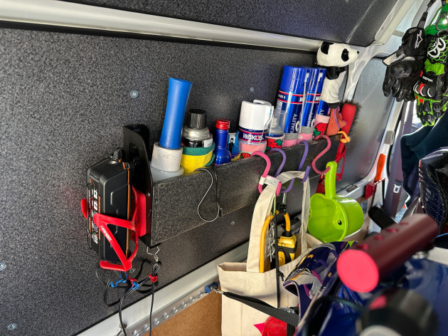 さらに、ウィンドウパネルやトレー類を活用してバイク用品をスマートに収納されています。