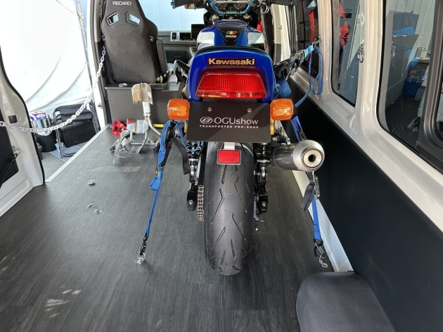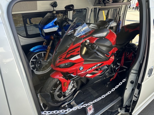積載した車両はカワサキ「ZRX-1200R」とBMW「S1000RR」の大型2台!スーパーロングワイドボディであれば大型バイクも2台積載が可能です。