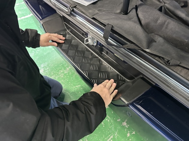 ステッププロテクターを取付けることで、オーナー様やわんちゃん達の乗り降りで純正ステップが傷つくのを防ぎ、縞目の突起が滑り止めの役割を果たしてくれます!