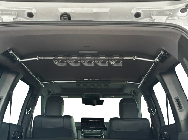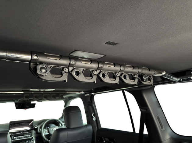 ランクルのデッドスペース空間を活かして、収納スペースを作ることができるESサイドマルチパイプラックと釣り竿を天井に積載できるESロッドアタッチメントをカスタムしました。