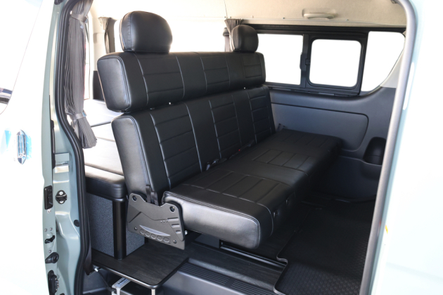 荷室にはSTシートやSHダブルフリップベッドを設置し、こちらもシートカバーと同じブラックレザーで統一。